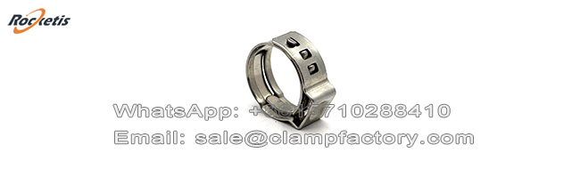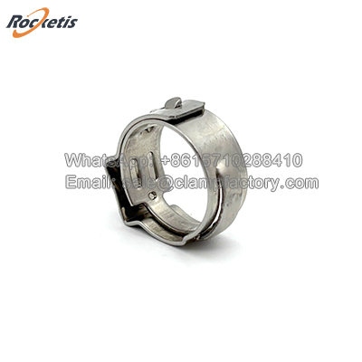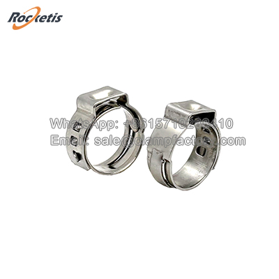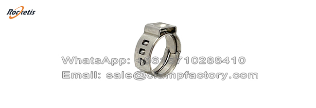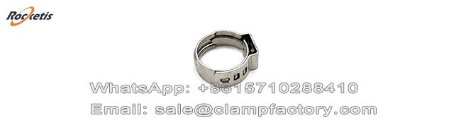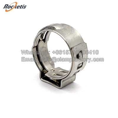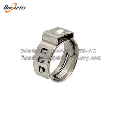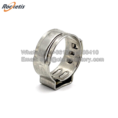 The 505 Series Stainless Steel one ear clamp is a specialized, non-adjustable hose clamp designed to provide constant, spring-loaded clamping force. Unlike worm gear clamps, it contains no screw, thread, or moving parts. Its functionality relies entirely on the inherent spring tension of its pre-formed stainless steel band and the unique "single-ear" latching mechanism.