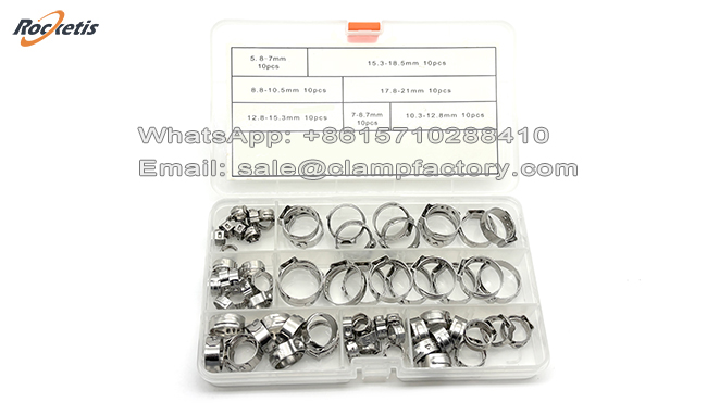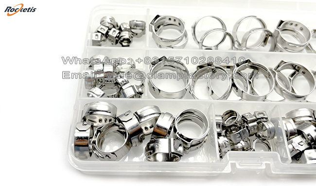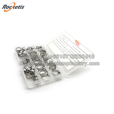 A Single Ear Hose Clamp Kit is a practical and organized set containing an assortment of single ear hose clamps. This type of clamp is a spring-loaded, constant-tension clamp prized for its simplicity, reliability, and excellent performance in applications involving vibration and thermal cycling.