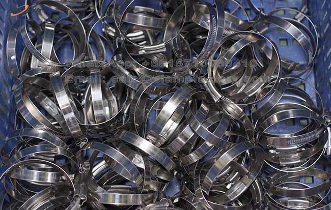 Stamped Saddle and Worm Screw: A stamped steel saddle (or housing) encapsulates a hexagonal-head worm screw. As the screw is turned with a screwdriver or wrench, it engages with the grooves on the band, pulling the band through the saddle to tighten the loop.